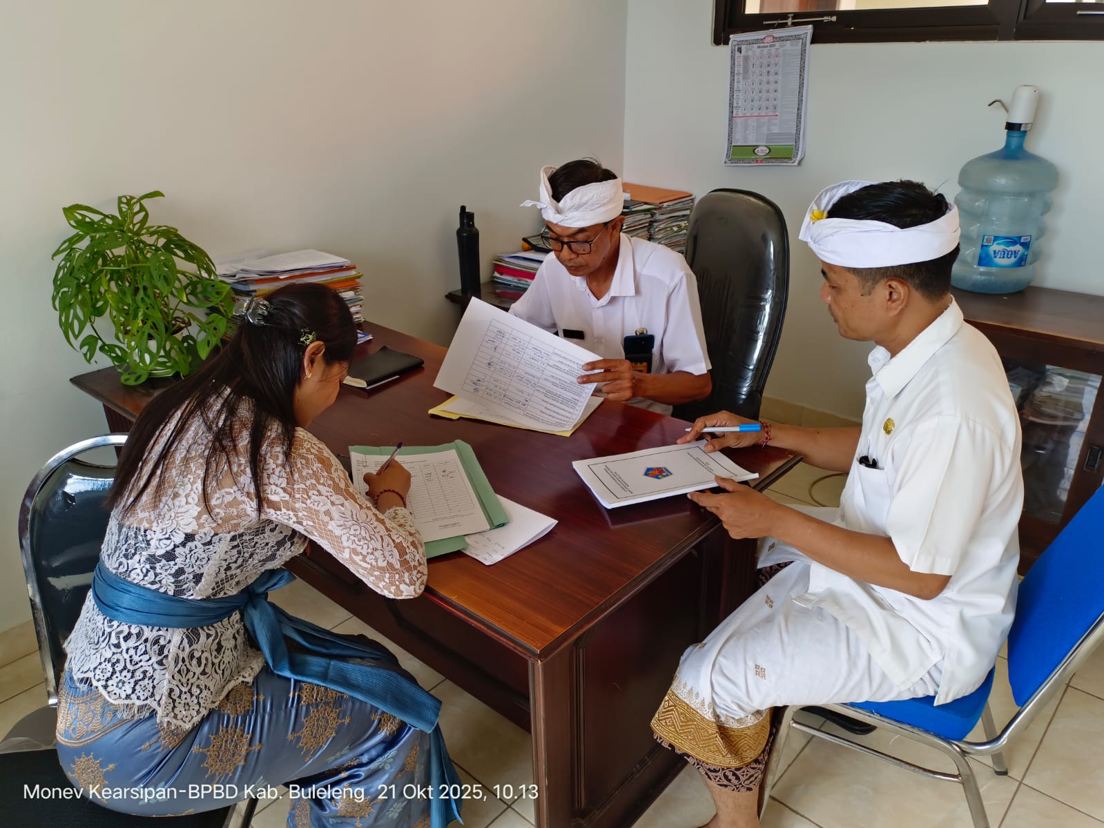 Selasa tanggal 21 Oktober 2025 DAPD melaksanakan kegiatan Monitoring dan Evaluasi (Monev) hasil pengawasan kearsipan internal, bertempat di Kantor BPBD Kabupaten Buleleng. Kegiatan ini bertujuan untuk menyampaikan hasil rekomendasi pengawasan kearsipan internal di Kantor BPBD Kabupaten Buleleng.