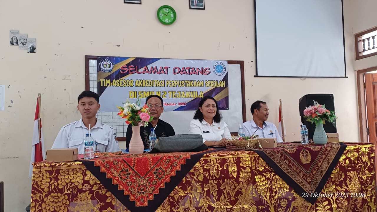 Visitasi akreditasi Perpustakaan Widya Saras SMP N 2 Tejakula telah sukses dilaksanakan pada hari Rabu, 29 Oktober 2025. Proses pendampingan ini difasilitasi langsung oleh Asesor, Dr. Made Hery Wihardika Grihadi, S.H., M.Si dari Undiksha dan di dampingi oleh Made Era Oktarini, S.TP, MM selaku Kepala DAPD beserta tim. Kegiatan berlangsung lancar dengan partisipasi aktif dari Kepala Sekolah, Bapak I Gede Astika, serta didukung penuh oleh Kepala Perpustakaan, Ibu Ni Luh Parmita, beserta seluruh tim perpustakaan. Berdasarkan hasil verifikasi dan penilaian, Perpustakaan Widya Saras berhasil meraih nilai akhir 92,6, yang menempatkannya pada status akreditasi A.