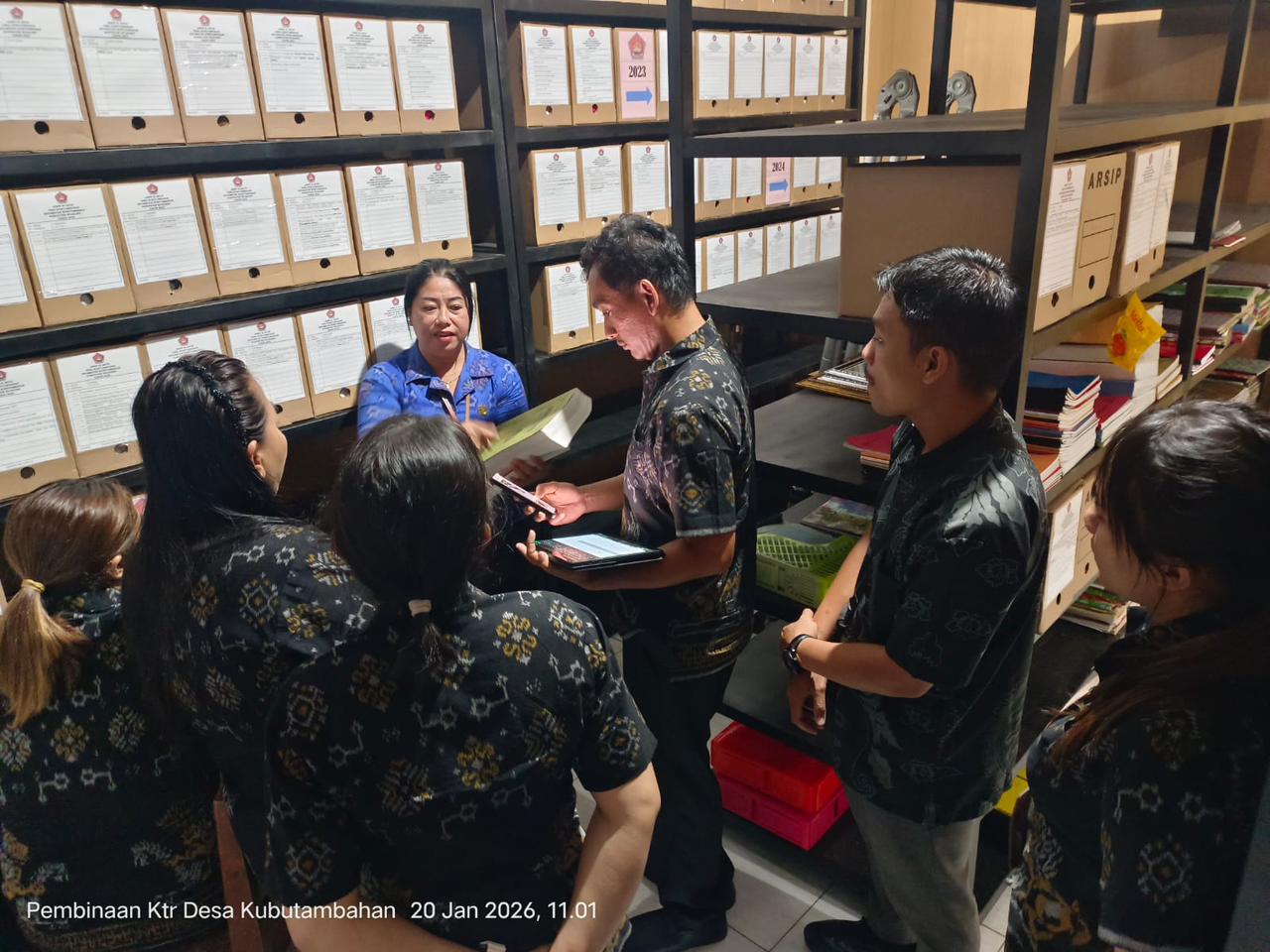 Tahap awal persiapan Lomba Kearsipan Desa/Kelurahan se-Kabupaten Buleleng Tahun 2026, Dinas Arsip dan Perpustakaan Daerah (DAPD) Kabupaten Buleleng melaksanakan Pembinaan Kearsipan di Kantor Desa Kubutambahan, Kecamatan Kubutambahan, Selasa (20/1/2026). Arsiparis Ahli Muda DAPD, Gede Astutiyasa, SE, memberikan arahan serta rekomendasi perbaikan sesuai standar penilaian lomba kearsipan, sekaligus mengevaluasi sistem kearsipan yang telah berjalan. Kegiatan pembinaan dikemas melalui pendampingan teknis langsung, meliputi pemilahan arsip, pengisian kertas picis, hingga penyusunan daftar berkas dan arsip inaktif guna meningkatkan tata kelola arsip Desa Kubutambahan. Hadir dalam kegiatan ini Sekretaris Desa Kubutambahan, Kadek Agus Sugiartana, bersama para Kasi dan Kaur desa.